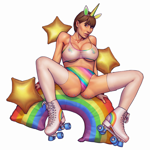 To celebrate pride month, I wanted to do something very colorful… and I think I found a fantastic way to do so with this mind blowing photoset! :D Yes, this is another set that I built in my workshop. I wanted to showcase the LGBTQ+ flag in my photoset and building a staircase happened to be the perfect way to integrate the new colors and patterns of the flag in the background. :) Then I found those beautiful rainbow roller skates… and I realized I’d have to pose with roller skates in a staircase! lol But it was worth it, I love the pics and hope you will enjoy them too! By the way, if you like unicorns, make sure to look at all the pics on my store… a lovely surprise is waiting for you! ;)