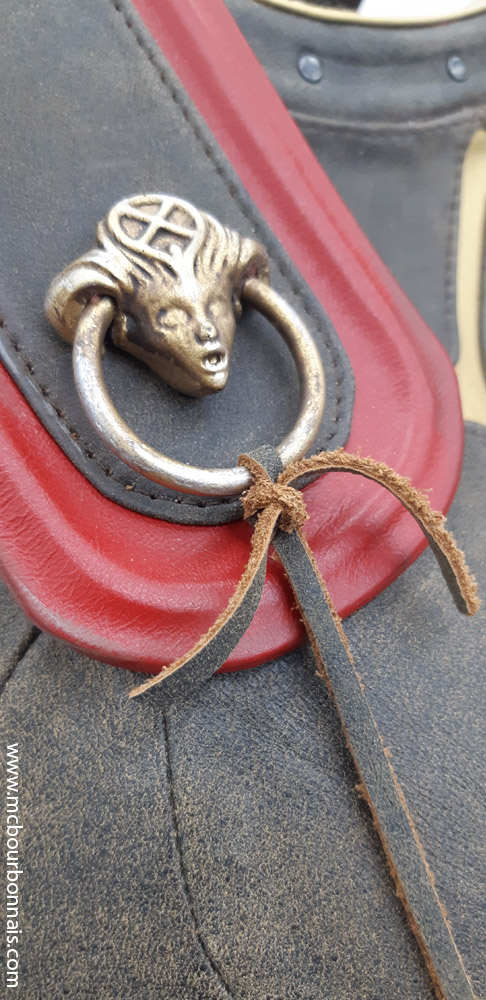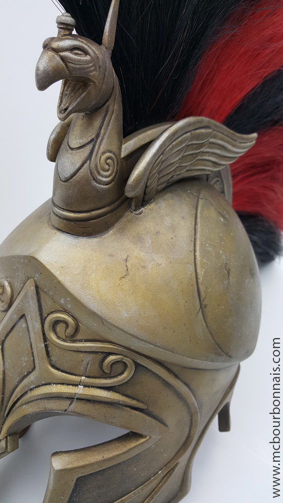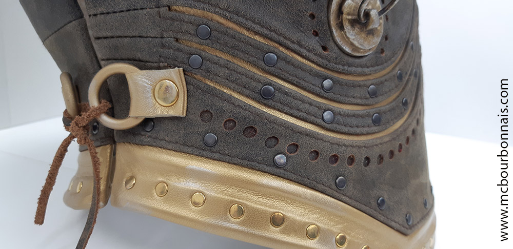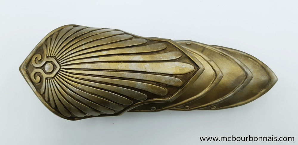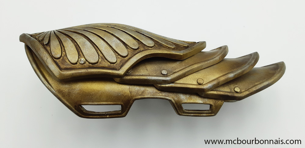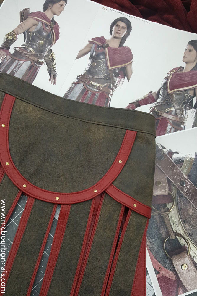 Notice that the proportions of the plastron are different from the original. It’s always a challenge to incorporate my breasts in a costume that was designed for a more ‘standard’ figure. Since my breasts take a lot of room on my thoracic cavity, my plaston looks shorter than Kassandra’s. There was less room under my breasts to place all the design details. When I draw a costume’s pattern, adjusting the proportions to my measurements is always a challenge.